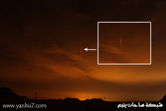 ورد جوال كون استفسارات من ينبع، حول مشاهدة خط مضيء لونه برتقالي، استمر من الساعة 7.30 حتى 9 مساء وفقاً للمشاهدات، وذلك فوق أجواء ينبع يوم الأربعاء الماضي 1 صفر 5 يناير 2011، وبعد الاطلاع على الصور ومقاطع الفيديو لهذه الظاهرة الضوئية السماوية النادرة تبين ما يلي: